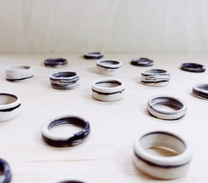 Most Pattern & Patch rings are made with porcelain clay, with the exception of black & white rings are made from black clay, mixed in with white porcelain.